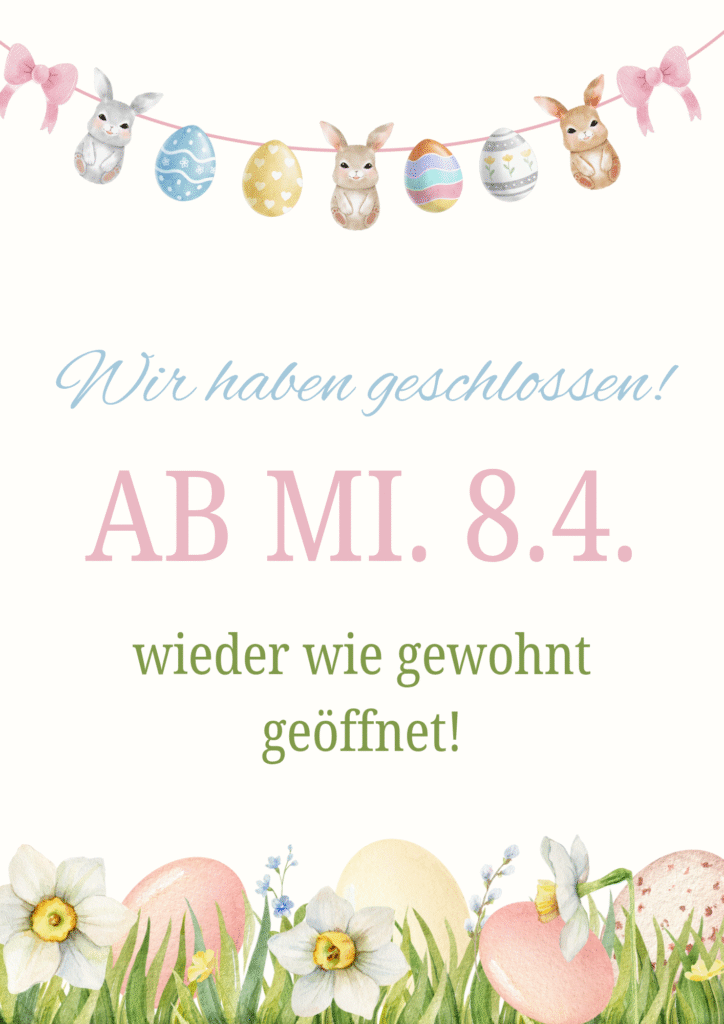Liebe Gäste, bitte beachtet, dass unser Restaurant über die Osterfeiertage geschlossen bleibt. Ab Mittwoch den 8.4.2026 sind wir wieder wie gewohnt für Euch da. Wir wünschen Euch und Euren Familien ein schönes und erholsames Osterfest!